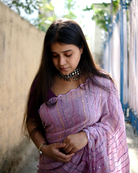 Monsoon Rain ( Embroidered Mulmul Purple Saree )