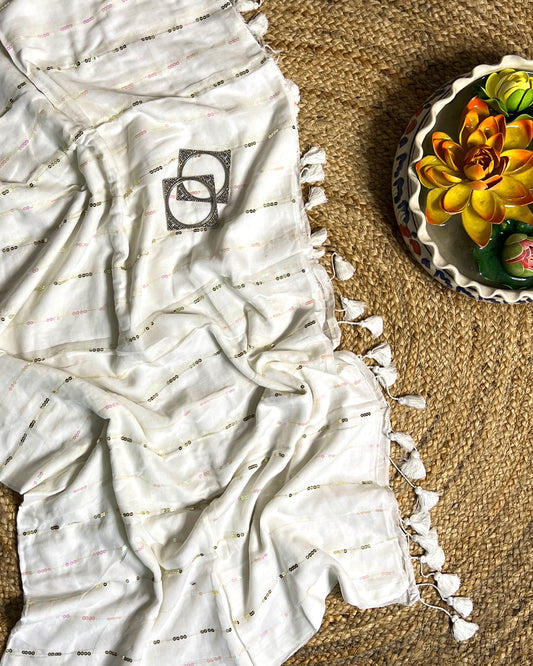 Sunny Sparkle ( Embroidered White Mulmul Saree )