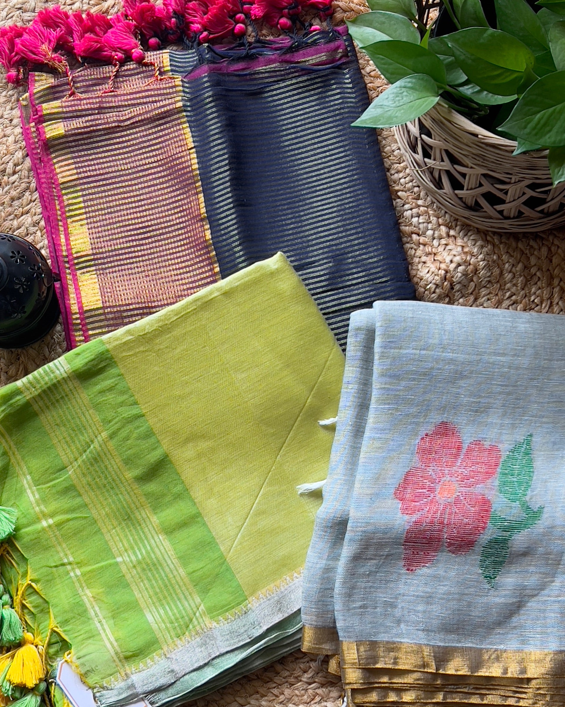 Let your confidence flourish with our heartwarming "Mystic Muse " saree combo! This charming collection of 3 sarees, curated from a diverse range of fabrics, seamlessly blends tradition with modern style, creating a fresh and feminine look. Each saree is designed to make the wearer bloom like a flower, with diverse hues, delicate patterns, and a touch of elegance.
